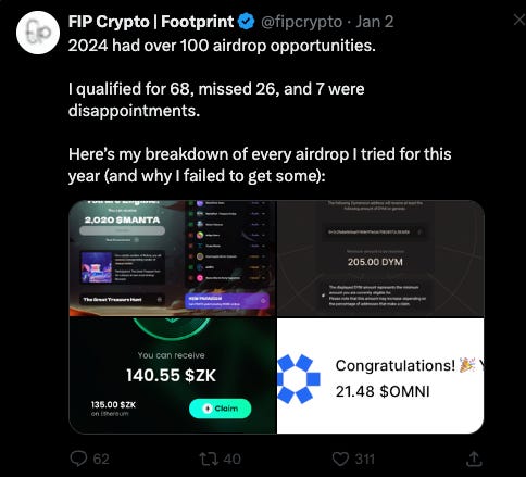 The returns that we get from airdrops keep getting lower as allocations are split among more participants (or greedy projects giving low allocations to the community).