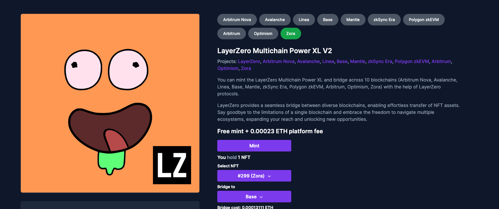 You can mint this NFT on the Zora network, and then bridge it over to Base, Aarbitrum or Optimism as a LayerZero transaction.