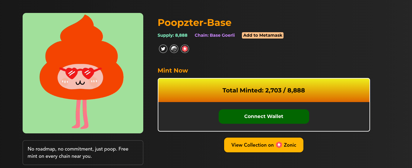 Similar to what I mentioned in my previous newsletter, Poopzter NFTs are available across 9 different networks (mainnets and testnets), including Base, Scroll, ZetaChain, Mantle and Linea.