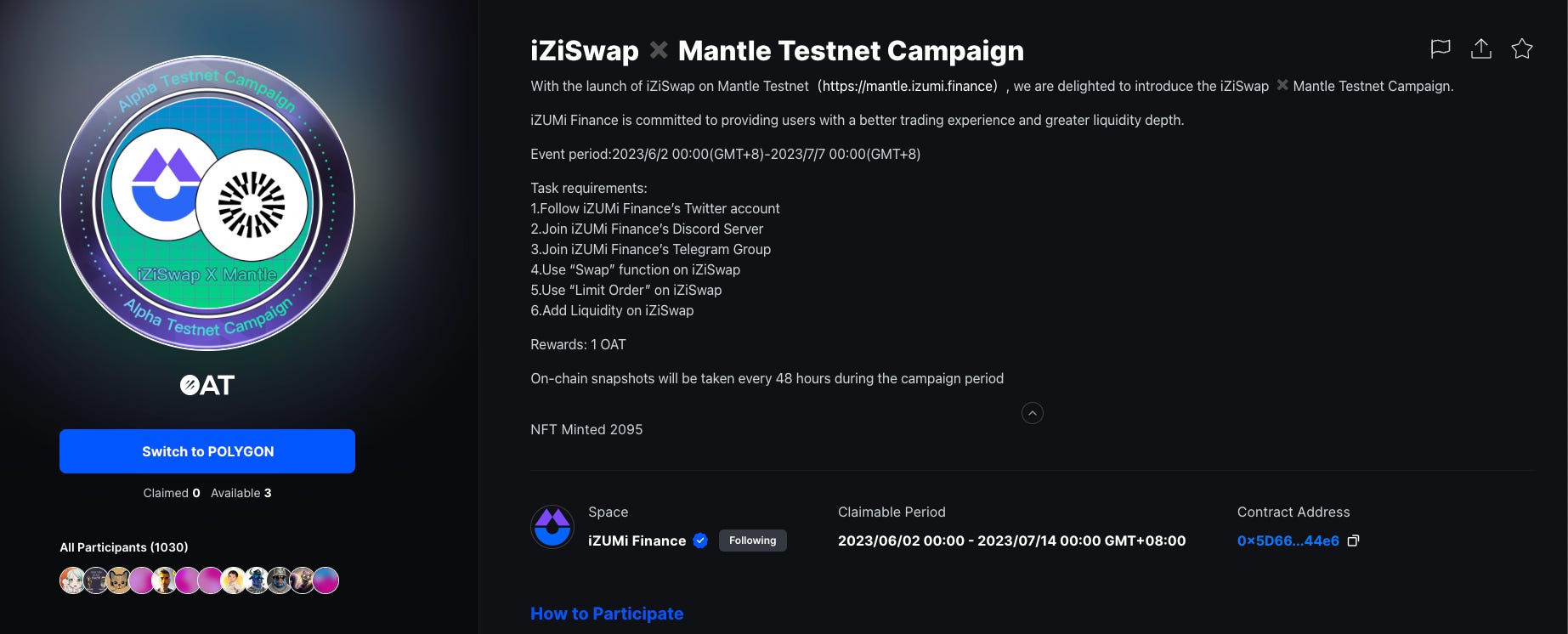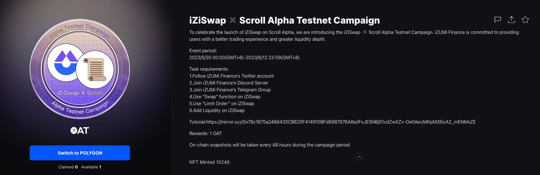 Similar to Scroll, you can complete this Galxe quest for iZiSwap.