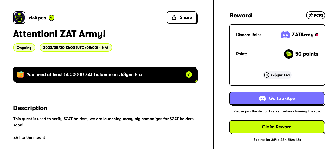 If you’ve managed to get the zkApes airdrop, you can claim a new Discord role with QuestN.