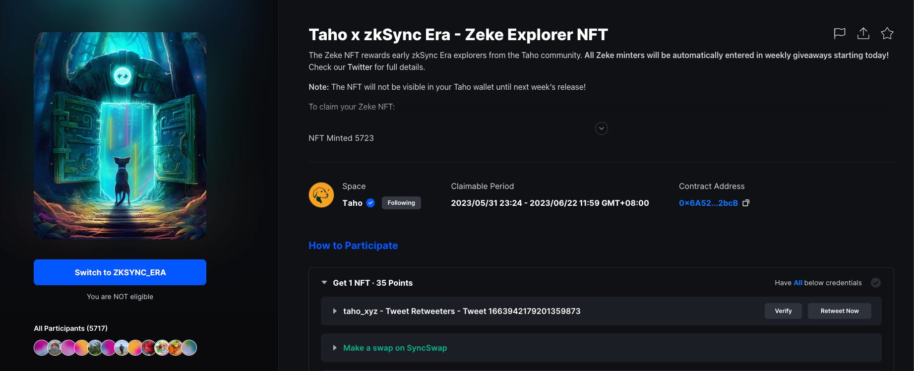zkSync Era has partnered with Taho wallet, and you can complete this Galxe quest if you’ve made a swap on SyncSwap and signed the Web3 pledge.