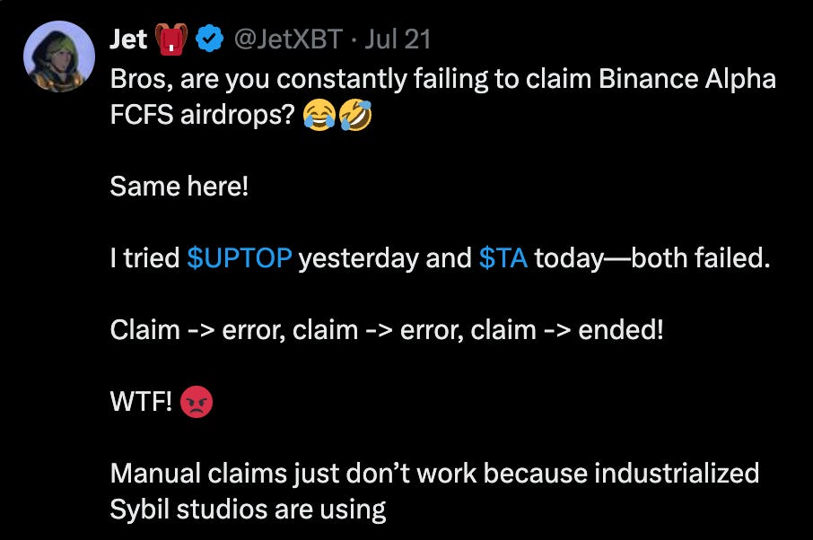 Binance Alpha is now full of Sybils, and the allocations are now heavily diluted thanks to them.