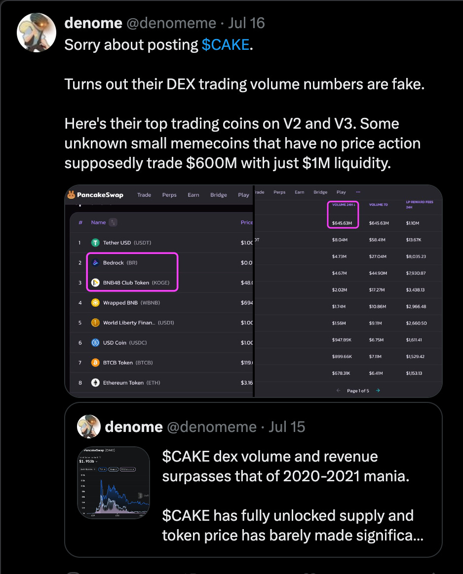 All the wash trading between USDT and Alpha tokens has artificially inflated the metrics on Pancakeswap.