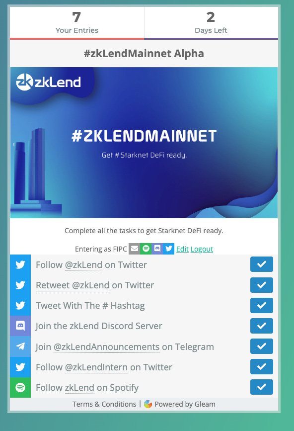 zkLend is a lending platform that is set to go live on StarkNET. With the mainnet launch, they require you to perform some Gleam quests, and there are only 2 days left to complete them all.