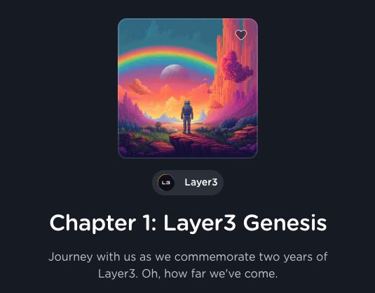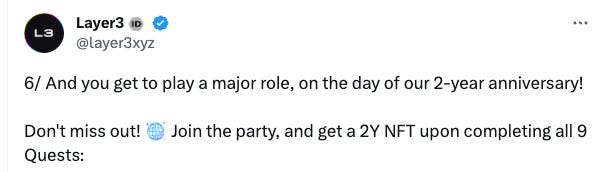 To mark its 2-year anniversary, Layer3 is launching a 9-chapter campaign where you can get an exclusive NFT by completing all tasks.