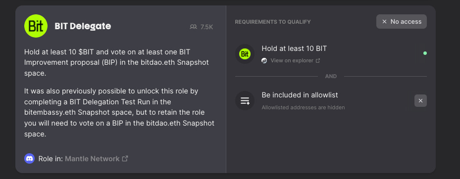 This could help you get the BIT Delegate role on Mantle’s Guild, which requires you to own at least 10 $BIT and vote on one proposal on Snapshot.