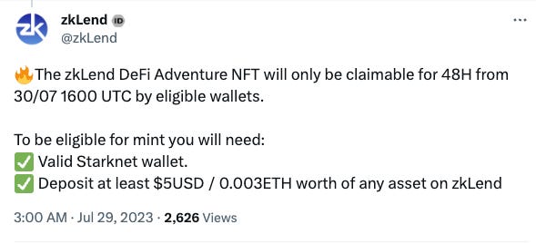 zkLend mentioned that they will be issuing a DeFi Adventure NFT if you deposited at least 5 USD into the platform.