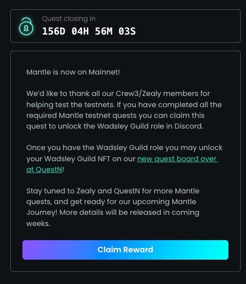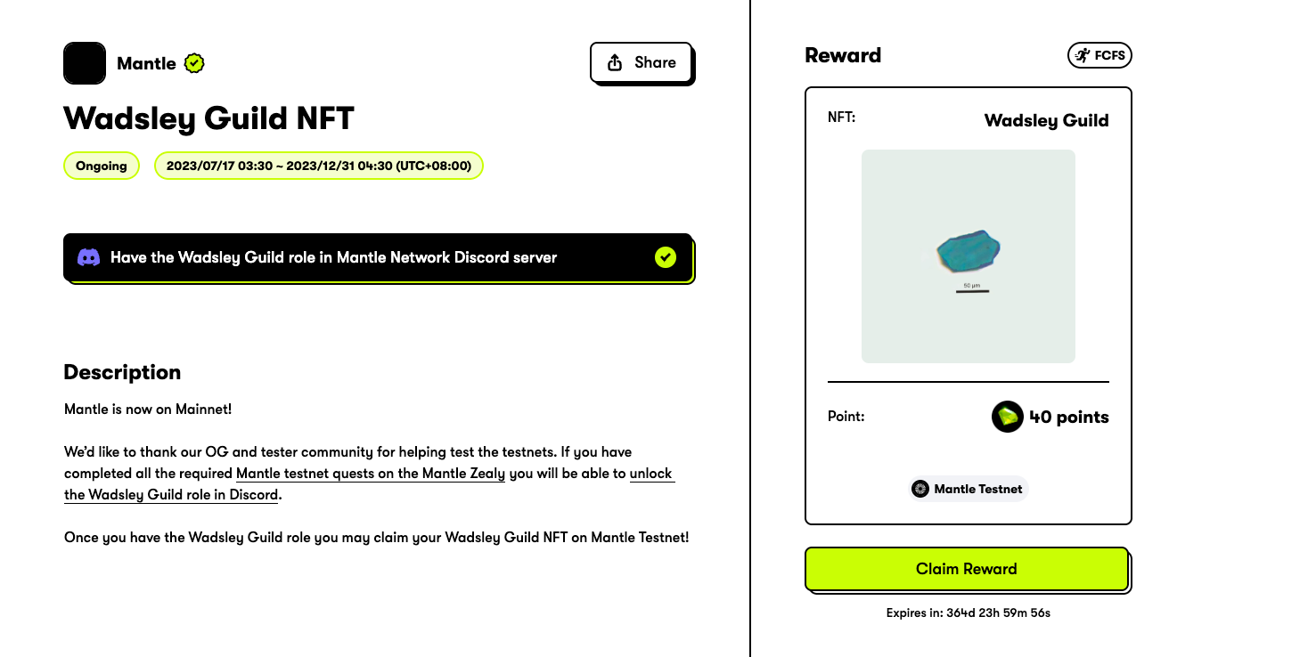 If you have been active on the Mantle testnet, you can now claim the Wadsley Guild role on Zealy.