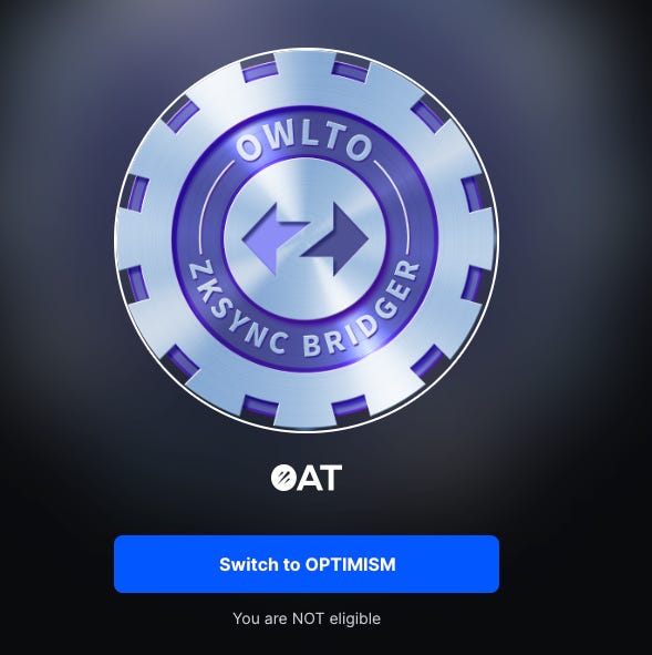 This bridge looks eerily similar to Orbiter Finance, and you can claim this OAT after completing a bridging transaction to / from zkSync and finishing social tasks.