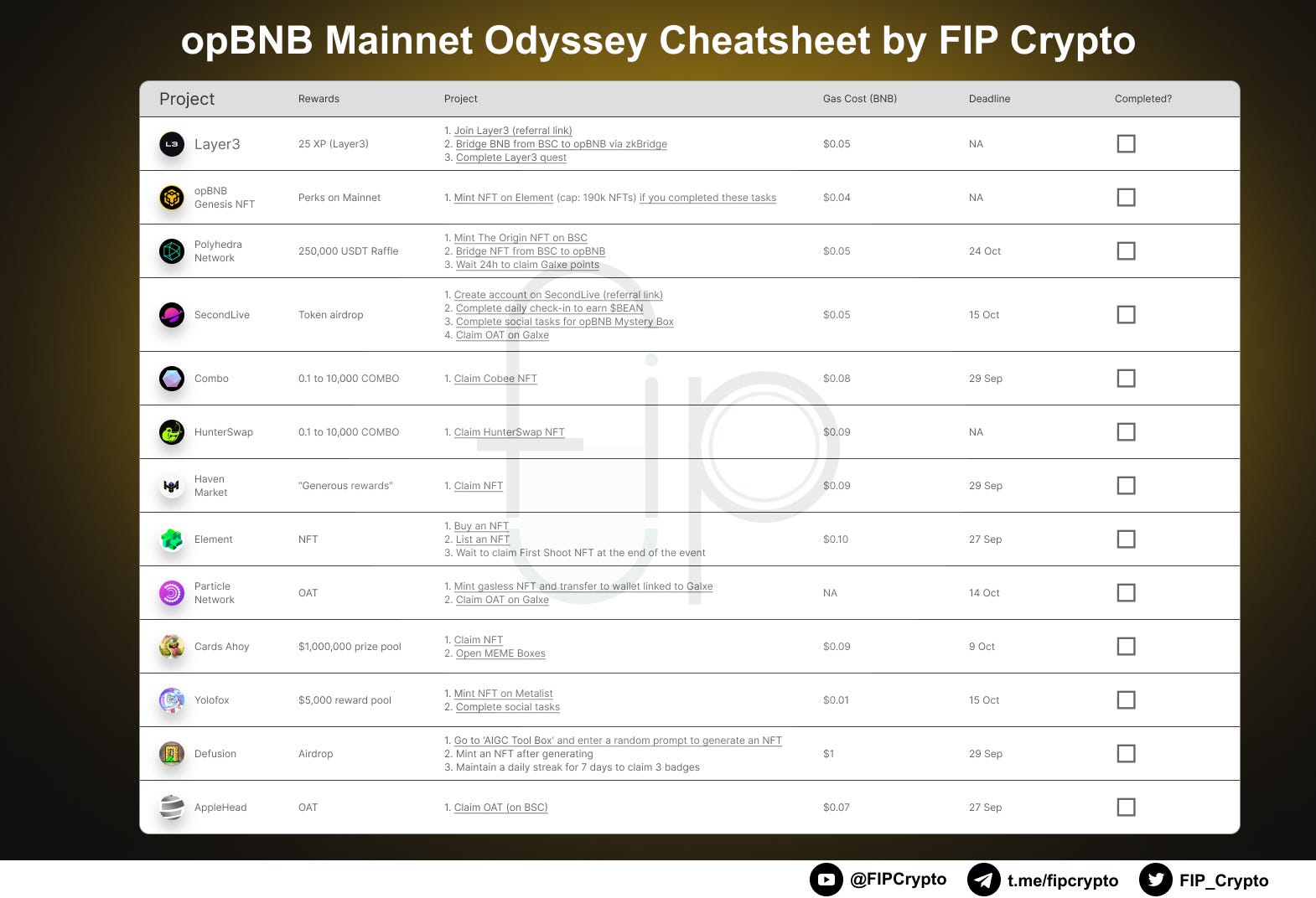 I created a cheatsheet for all 13 campaigns that are currently running for opBNB that could bring about some rewards.