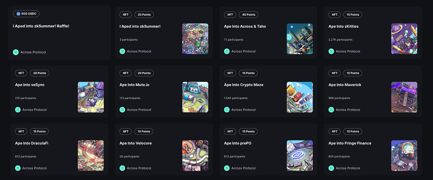 There are 16 different tasks, most of them don’t require any on-chain transactions, except for Mute.io, veSync, and Velocore (swap 10 USDC each to WETH).