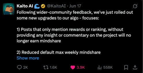 But Kaito has now made the change to avoid awarding mindshare to these posts: