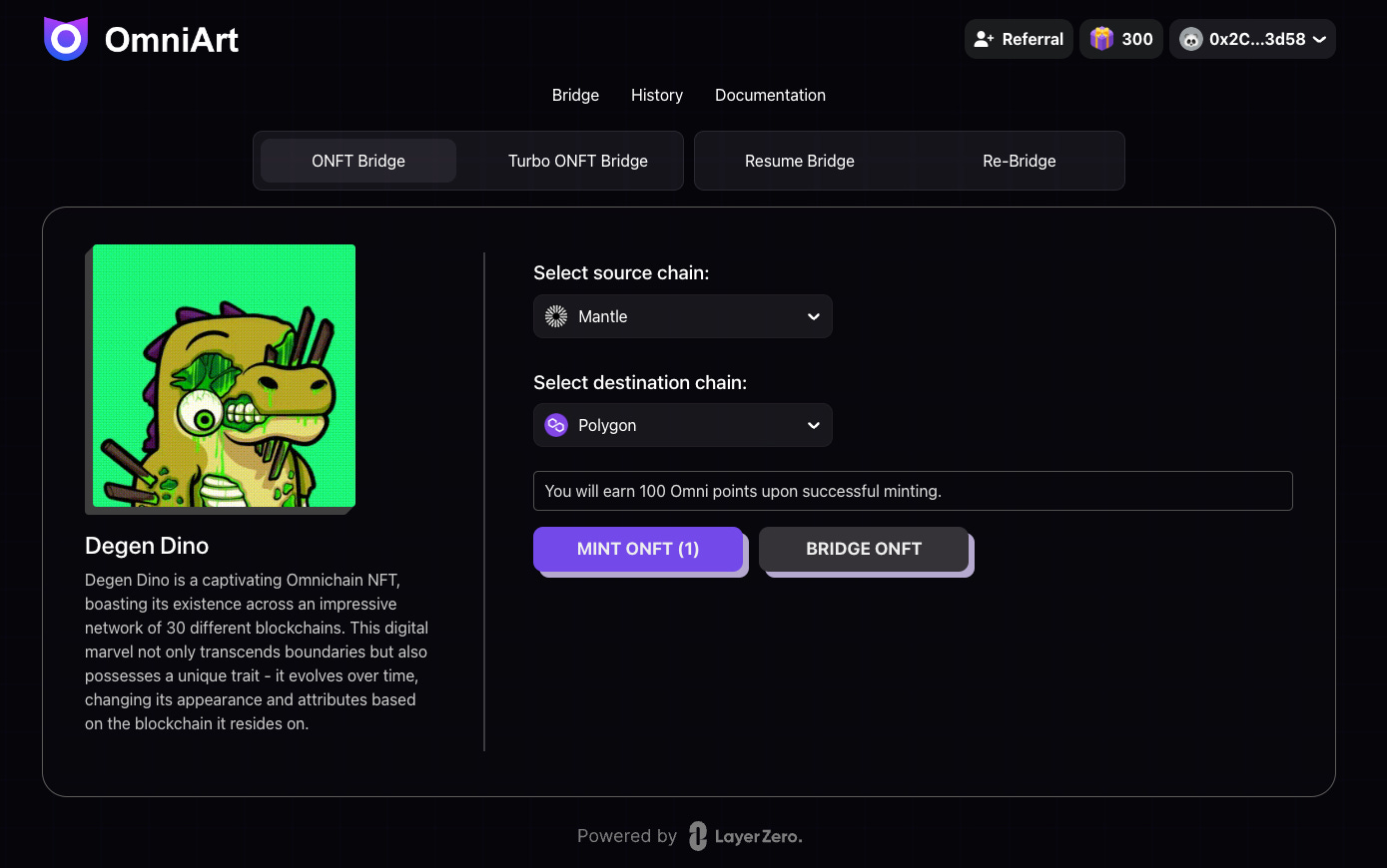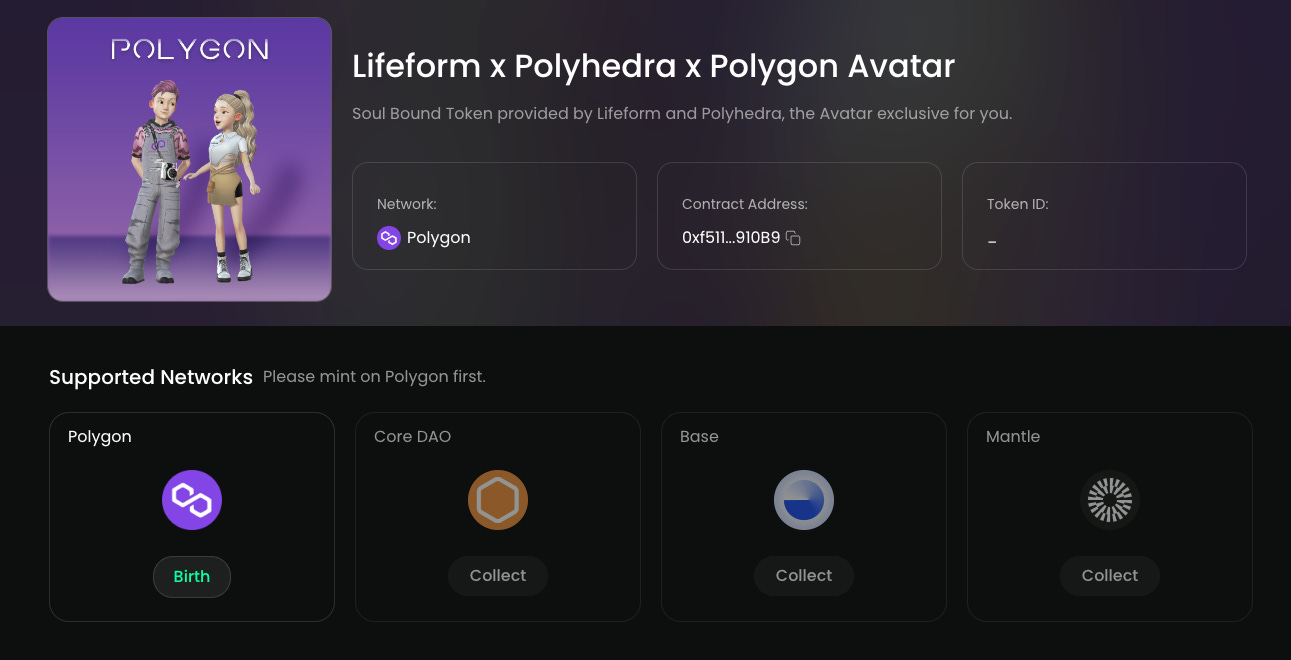 After minting the NFT on the Polygon network, you can bridge it to the Core, Base and Mantle networks (it’ll count as LayerZero transactions for each bridge).
