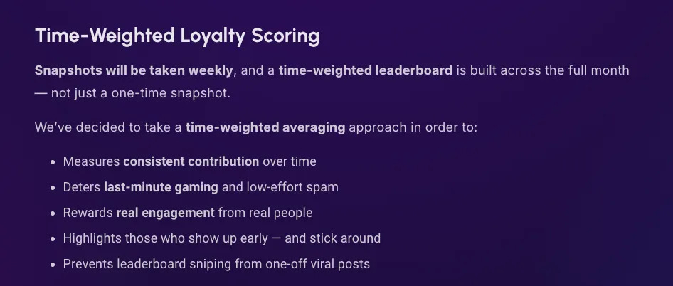 This prevents gaming where any account with a significant following can jump in at the last moment to outrank everyone.