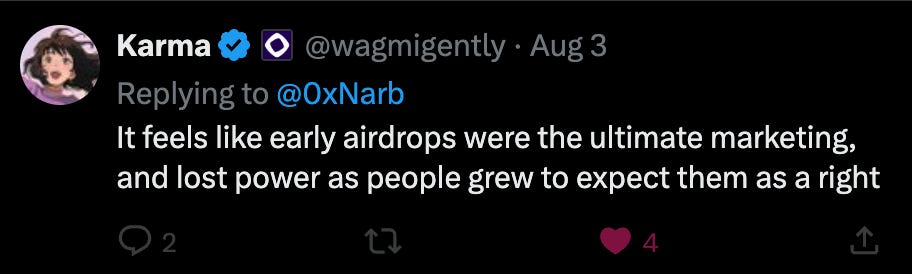 Projects have also shifted their focus from airdrops as awareness tools to ones that are for retention.