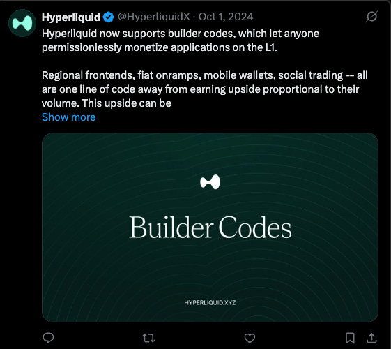Builder codes were launched in 2024, where anyone could build a platform while using Hyperliquid as the backend.