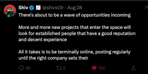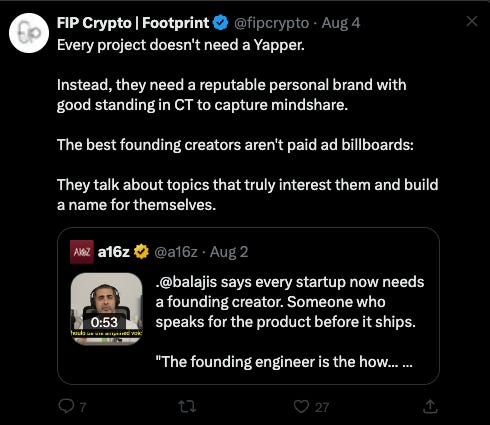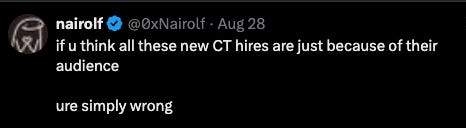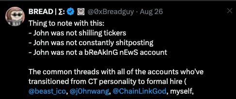 We have seen an influx of respected personal brands getting jobs at Web3 companies as a CT Lead, or founding creator (as shared by @balajis).