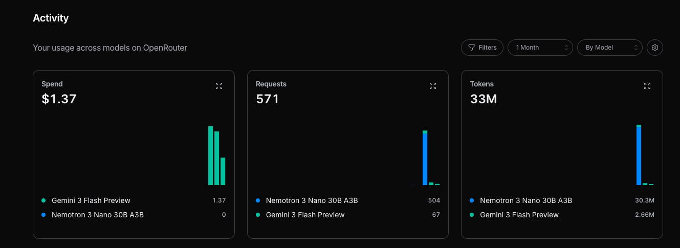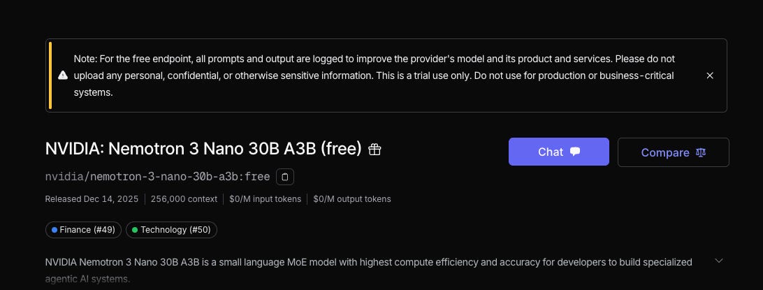 I found out about these free models through Nvidia’s tweet promoting their free Nemotron 3 Nano 30B version on OpenRouter.