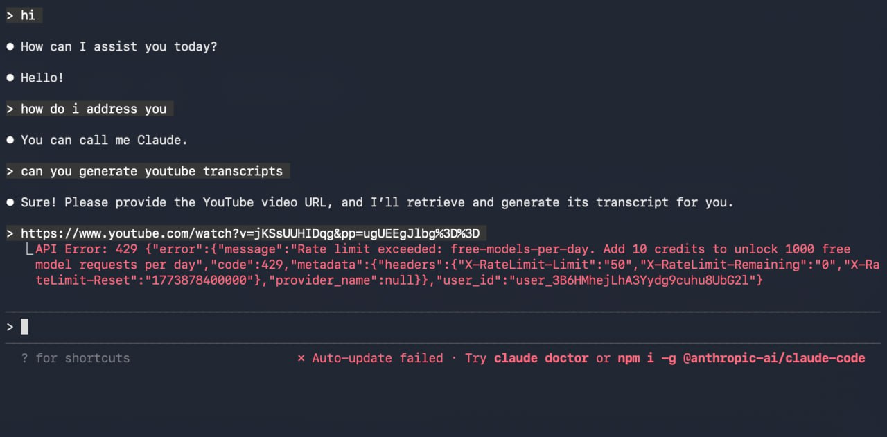 I knew that it was not possible for Nemotron to give me unlimited inference, but it hit the 50-request limit a day very quickly after I asked it to generate a YouTube transcript.