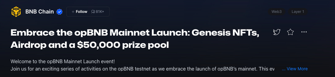 The opBNB mainnet is launching soon, so there’s likely to be a launch campaign. The first quest is to complete social tasks to claim some points.