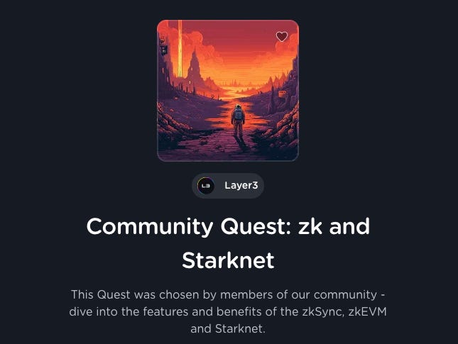 A slightly more complicated quest this time, where you’ll need to swap on Mute (zkSync), swap on QuickSwap (Polygon zkEVM), and bridge funds to StarkNET using either network via Orbiter.