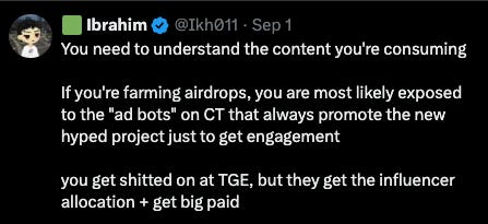 Others would shill an airdrop now because of Kaito or a referral link, and we always need to question why someone is posting about a project.