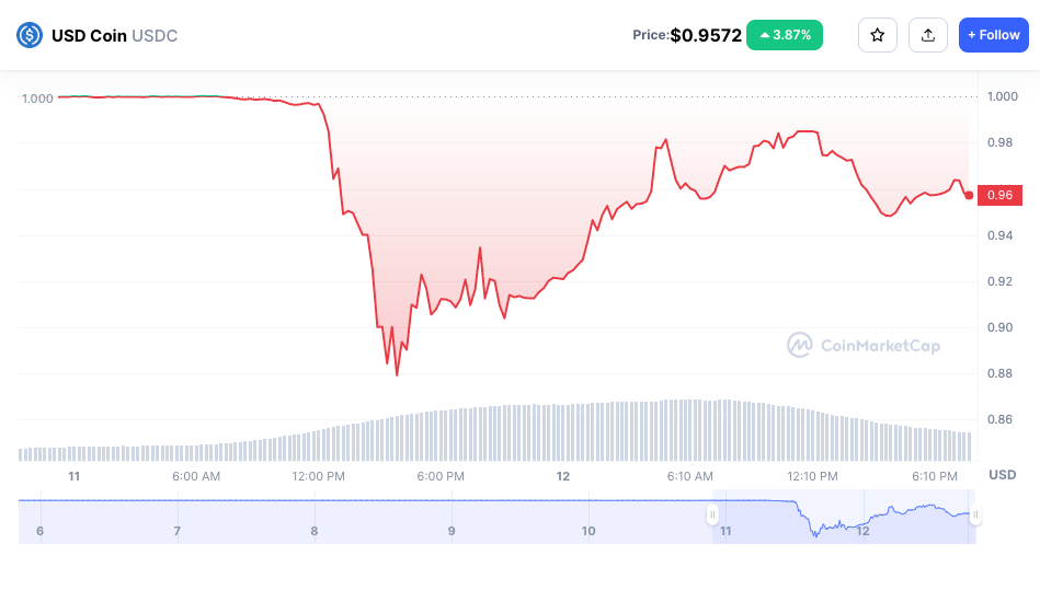 USDC finally started to increase in price after this news, but it still remains around $0.95.