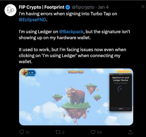 Unable to sign transactions on networks: This mainly affects me on Solana and SVM rollups (like Eclipse/SOON), where I’m unable to sign any transactions with a Ledger. This made me stop using Eclipse as I couldn’t explore some DApps in the ecosystem